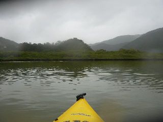 マングローブには塩分を濾過するというすごい能力がある。 南の瀬戸内町の方まで行き引き返す。 雨の中小太郎峠へいく。その先抜けれるのかなと思い 霧の中林道を進むが、砂利道になり元来た道を引き返す。 日も暮れた七時頃ホテルへ戻る。この日は和食だった。 葉っぱの酢みそ和えのような物が美味しかった。 |