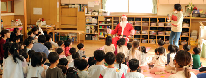 | 今年もたくさんのプレゼントを持ってサンタさんが来てくれました。心なしか少し若くなったサンタさんに子どもたちは大喜び。プレゼントの中身が気になって仕方がありません。来年もよろしくお願いします。 |