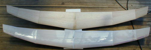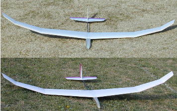 きむらクラフト新鋭HLG Virgil2K−1に新型主翼を投入しました。 4/8の筑波宇宙センターHLG大会以来、既存の主翼の旋回性に若干の不満を覚え、 旋回性を向上させた主翼の製作をしました。 上の画像の下側が既存翼、上側が生地完成状態の新型翼です。 最大の変更点は上反角で、旋回性を高めるために若干(ほんとに僅かですよ)強めに設定 しました。 中央 4°から5°へ 二段目10°から12°へ 三段目20°変わらずです。 スパンを変えないために外翼を15o延長しています。 それと内部ですが、補強のロービングの配置を変更しました。 後ほどUP予定のスチロールコア翼の製作でも紹介しますが、きむらクラフト製の主翼には スパーもカンザシも入っていません。 主翼をカーボンロービングとガラスクロスと構造強度だけで支えていますので、ロービングの 配置は重要です。特にこの主翼のテーパーのきつい部分のねじれ強度を確保するために 変更しました。 上が既存翼、下が新型翼。撮った角度が違うので解りずらいですねー。 現物を並べてもぱっと見変わりません。 ですが、飛ばすと一目瞭然!舵の効きがまるで違います。たかだか2°ですが、 横滑りをバンクへと変換する力は大きな物がありました。 ほぼ狙った通りの性能で、今までより遙かに敏感にスティックに反応します。 ただ、上反角が大きくなった分、センタリング性も強くなっていて、乱暴に舵を打つと 暴れ気味になりますが仕方ないですね。 あと、主翼付け根裏側の削り込み不足でしょう、若干取り付け角が増えてしまったみたい です。ランチで上を向く角度が強くなってしまいました。 これは、削り足りなかった部分をアイロンで強く押さえて修正して解決です。 実質、主翼が増えたのでVirgil2KとVirgil2K−1の同時飛行が可能になりました。 これはこれでうれしいきむらでした。 |