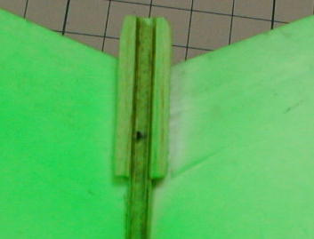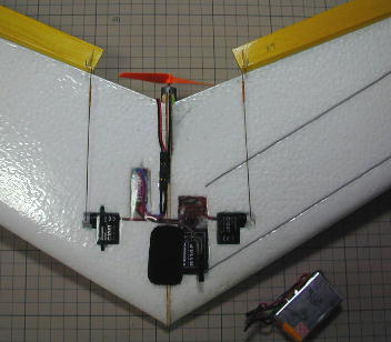 メカ類は全て主翼にリューターで穴を掘り差し込んで、テープで止めてあるだけです。 オリジナルでは、エレボンのヒンジラインと直角になるようにリンケージを配置するの ですが、中心線と平行になるように変更しました。 コントロールホーンは0.5ミリFRP板です。 ![]() このリンケージ、一見動きが悪そうに見えますが、ホーンが0.5ミリと薄いために、 上手にホーンが首を振り、問題なく動いてくれます。 斜めのホーンはどうにも許せない のがグライダー屋さん...と言った所でしょうか。 バッテリーは携帯電話のバッテリーパックから取り出したリチウムイオン電池を2セル パックにした物をマジックテープにて主翼下面に取り付けます。 アンテナ線も主翼にモールドしています。 1ミリ幅でフイルムと発泡スチロールを切り 取り、アンテナ線を埋め込んでクリアテープ塞いであります。 エレボンはテープヒンジ、垂直安定板は両面テープで固定してあります。 |
