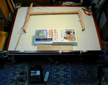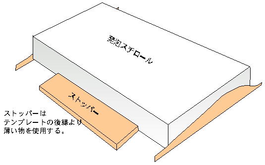 | まず、ベースが動いてしまわないように定盤に固定します。 両面テープなどで止めても良いのですが、 ストッパーになる物に当てて固定するだけで充分でしょう。 さらに、ベースに均一に重しを掛けます。ラジコン技術程度の重さが ちょうど良いようです。 ![]() |