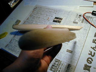 | オス型編1です。 まず、図面を元にオス型を作成します。 図面は三面図を描いて下さい。形状は自由ですが、きつい曲面やエッジに なる部分は避けたデザインが無難です。 ですが、自分なりのコンセプトを考えて作ると楽しいと思います。 今回の私のコンセプトは”握って走れる”で、しっかり機体をホールドするため、 機首部分の直径、形状は私の手の大きさに合わせ、主翼の乗る部分を幅広く、 高翼風になる様、ブームの取り出しを下に下げたデザインを考えました。 素材はバルサ、スタイロフォーム、桐材などがありますが、入手しやすい物なら 何でも良いと思います。ただ、スタイロフォームはポリエステル樹脂で 侵されますのでエポキシ樹脂の時だけです。 私は20o厚のバルサを使用し、左右2分割のオス型を作成しました。 合わせ目になる面に割ピンを入れ、2枚のバルサを両面テープでつないで 40o厚のバルサブロックを作成します。 |