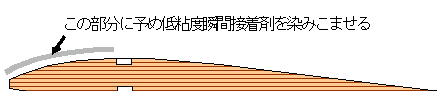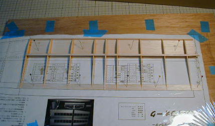 | ムサシノのHPには詳しい製作方法が載っていますが、ポイントとしては 前縁材の向きに気を付けることと、櫛形スパーにリブをはめ込む時に 無理なくはめ込めるように借り組などをして事前に良く確認して置いて下さい。 接着剤には全て瞬間接着剤を使用します。上面プランクまでは低粘度、 上面プランクには中粘度もしくは高粘度接着剤を使用します。 ![]() パーツのバルサ材同士は組んだ時に隙間が無いように調整して下さい。 隙間がありますと強度が著しく低下します。上面のプランクをする際は、 まず大きめなサンディングブロックで リブとスパー、前縁材の段差が無くなるようにサンディングしてならします。 そして、リブの木目でバルサ材の繊維が切れているところに低粘度瞬間接着剤を 少量染み込ませます。 これにより、この後に中粘度瞬間接着剤を塗っても染み込んだりすぐに 硬化せずにプランクをすることが出来ます。 リブ、前縁材、スパーに瞬間接着剤を塗り、まず前縁とプランク材を圧着し、 それから麻雀のパイを並べるように手を広げて全体を圧着するようにします。 ![]() リブキャップは手間が掛かりますが、1本1本丁寧に合わせて接着して下さい。 このパーツは主翼強度に影響します。 今回は材料に余裕がありますので、 隙間が出来ないように微調整しながら作業を進めて下さい。 私は、リブキャップ材をリブに当ててカッターの刃でプランク材に合わせた 印を付けてから少し大きめにカット、後は押し込む様にして瞬間接着剤で 接着しています。 出来上がった主翼は、全体が滑らかになるようにサンディングします。 プランク材の波打ち、プランク材とリブキャップの継ぎ目の段差はサンディング によって完璧に取り除いておきます。 |