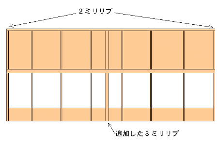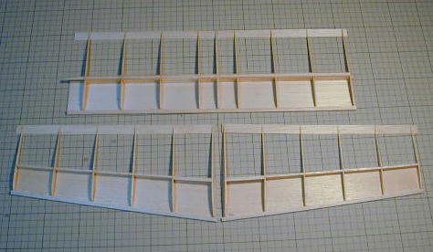 | 主翼はキットのオリジナルな構成の内、翼端部分と中央翼の片側を使います。 翼端部分はキットの指示のまま製作して下さい。 中央翼は左右接合部の間隔の短いリブのみ省略して60ミリ間隔に8枚のリブが 列ぶ短形翼を製作します。 キットのリブには1.5ミリ、2ミリ、3ミリ厚の3種類のリブが入っています。 両端に2ミリ厚のリブを配置して、後は1.5ミリの物です。 端の2ミリ厚のリブはキット添付の上反角ゲージBを使って傾けてください。 中央(4枚目と5枚目の間)に3ミリ厚のリブを一枚追加して下さい。 これが主翼の中心になります。 ![]() ウエブ材は全てのリブ間、前後に入れて下さい。 これで強度は充分保てると思います。 どうしても不安な方は、上面スパーのみヒノキ材に変更すると良いでしょう。 |