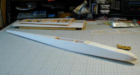 | ここが一番加工箇所の多い所になります。 主翼の縮小に合わせて、テールモーメントも縮小しなくてはならないので、 胴体の主翼から後ろを50ミリほど詰めます。主翼の長さに対して50ミリ? と思われるかも知れませんが、主翼の巾が変わっていないため、 思った以上に水平尾翼の容積を必要とするためなのです。 |