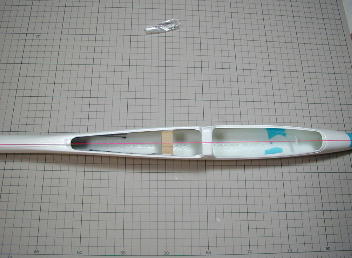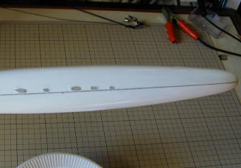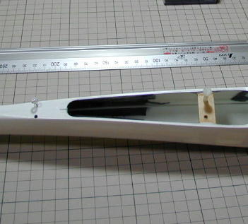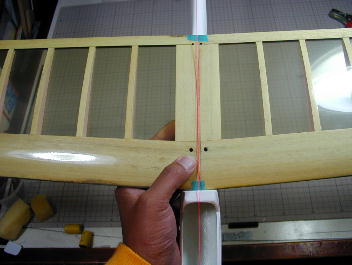| ウイングボルト穴を開けます。 その為にはまず、胴体の中心線を出さないといけません。 私は、胴体の機首部分とVテール取り付け部分を結ぶ様に水糸を張り、その線を胴体 中心線としました。 この主翼にはもともとウイングボルト穴が開けられているので実際に主翼を乗せて、ねじ 穴を開ける位置をマーキングしました。 |