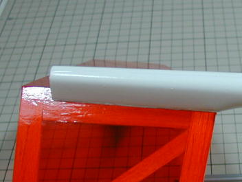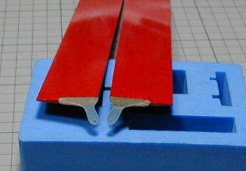 | 接着の前に接着面のフイルムは剥がしておきます。 この時にバルサに刃が極力入らない様に注意してください。 もし、刃が入ってしまったと 感じたら、フイルムとバルサの境目に極少量の低粘度瞬間接着剤を流して置いて下さい。 多量に瞬間接着剤を付けて接着面に広がるとその部分はエポキシ接着剤の着きが 悪くなります。 また、胴体側は離用のワックスが残っているはずですのでサンドペーパーでざっと削るか 脱脂材などのケミカル用品でしっかり脱脂して下さい。 脱脂が不十分ですと胴体から尾翼が離型してしまいますよ。 さらに、接着面は御覧の様に狭いので確実に接着してください。 |