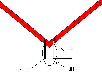 | ラダーにラダーホーンを製作し、接着します。 このラダーホーンは1oのFRP板より製作しましたが、0.5oでも良かったみたいです。 このホーンは動翼に対して125°の角度を付けて取り付けられていますが、 これは、リンケージロッドが胴体後部の開口部から出ているためです。 ホーンの有効長が10oになる様になっています。 |