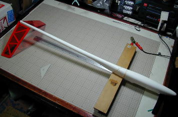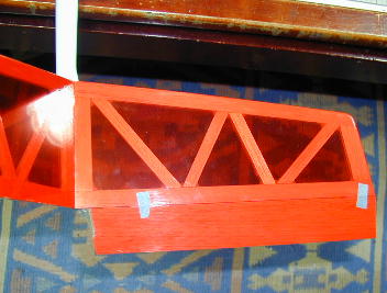 | Vテールの胴体への取り付けは角度が判りづらく、皆さん苦労するところではありませんか? きむらクラフトでは画像の様にして取り付けています。 胴体にゴムで取り付けられている角材はダミーの主翼で、胴体の主翼取り付け部にぴったり と合う様に取り付けられています。 これでVテールの先端とダミー主翼の端の4点がぴったり と付けば角度が合っていると言うことになりますね。 胴体にはV型の切れ込みがモールドされていますが、これはあまり当てになりません。 幸いピッチ方向の角度は合っていた物の画像の様に置くと、胴体と尾翼の間に僅かですが 隙間が出来てしまいます。 |