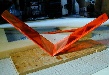 | Vテールの組み立てです。 V角度に付いての説明書きも当然付いていませんが、 接合部分にそれっぽい角度が付けられていました。 きむらクラフトとしては一般的で扱いやすい110°で組み立てました。 画像の様なゲージを作り、瞬間接着剤で接着しました。 ここはエポキシだろう?と思われる方もいらっしゃると思いますが、この後FRP製の 胴体へはべったりとエポキシで接着することになりますので、高々5o幅の芋付けは 作業性のすこぶる良い瞬間接着剤に”お任せ”と言うわけです。 |