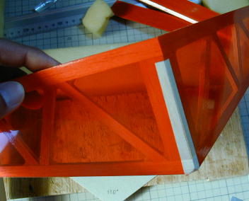 | Vテールに動翼をテープヒンジにより取り付けます。 テープヒンジにはクリアテープなどを使うのが一般的ですが、きむらクラフトではクラフトるうむ 製ウエットフイルムをヒンジテープに使っています。 このフイルム、薄くて丈夫なために動翼、固定翼間の隙間を少なくできる、動きが軽い等の 利点があり、また、裏紙が着いているので貼りやすいのです。 テープヒンジの施工例を載せました、クリアテープを使う場合、動、固定翼間のクリアランスを 1o以上取ってください。 |