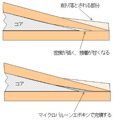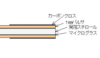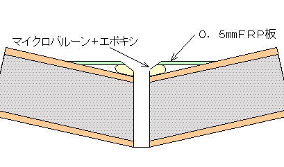 ねじ受け部分はこの様にしてあります。 0.5oのFRP板で作った受けと主翼の 間にはマイクロバルーンを混ぜたエポキシ接着剤が充填してあります。 プレートを瞬間接着剤で接着した後、マイクロバルーンエポキシを指で擦り込む 様にして充填します。 ![]() 断面はこんな感じになっています。 これは以前製作したDJ Aerotechのモナークからヒントをもらいました。 |