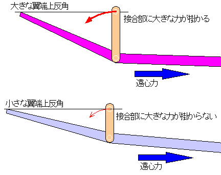 | 主翼のデザイン 平面形はこんなデザインです。 ![]() ラダー機用SAL専用翼をデザインする上で、上反角接合部部分にかかる力を 上の図の様に考えて、翼端部分の上反角を少な目に、中央部を大きめに設定 しました。 今まで壊れた主翼を見てきましたが、壊れているのは大抵がこの部分です。 ただ補強を強化するだけでは不足と考えてのデザインです。 ![]() |