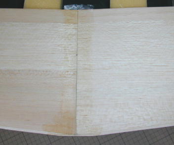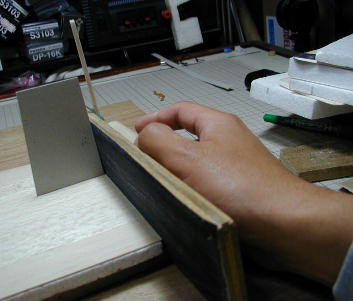 上反角はこの様に出します。 ボール紙で作ったゲージをガイドに曲がらない様に慎重に削ります。 でも、最終的には付き合わせ現物合わせで角度を出します。 外翼を接合しています。 この後に、接合部に一周マイクログラスのテープをエポキシ樹脂で貼り付け、 補強します。 接合部分の圧縮強度はカーボンロービングで、引っ張り強度を マイクログラスで持たせようと言う発想です。 ノーマルランチ用なら引っ張り強度はあまり意識していないので、これでお終い。 グラステープを貼り付ける時には樹脂を置いたらテレホンカードでしごいて余分な 樹脂をそぎ落とします。 ダウエルの入る周辺だけガラスクロスが2プライになっています。 |