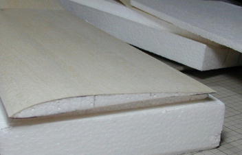 接合は片面に軽い重しを乗せ、もう片方にかいものをして接着剤の硬化を待ちます。 写真は主翼中央部の接合風景です。 左側に重し、右側にかいものをしています。 重しを乗せるのにネガティブシェルを使うと重りでプランク面に傷が付きませんね。 翼端部分の接合等では、左右2枚を並べて接合すれば左右の角度のばらつきを押さえる 事が出来ます。 きむらクラフトでは接合に5分エポキシを使用しています。 |