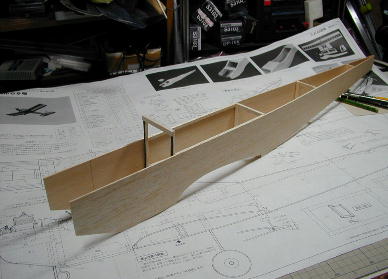 胴体の組み立てです。 図面の上に置いて、中心がずれないように瞬間接着剤で組み立てていきます。 いきなり「すらー」っと接着剤を流してしまうと、もう後戻りが出来ませんので、点付けで借り組 状態を作り、捻れなどを良く確認した上で接着剤を流します。 点付けなら剥がす事も比較的 容易です。 一番手前の胴枠に黒い線が見えますが、これはカーボンロービングで補強した後です。 本来ならキャビン部分が接着されるのですが、キャビン部分はバッテリー装着口として取り外し 式になりますので、胴枠単体の強度を確保しました。 |