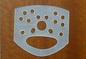 モーターマウントです。 例によって1.5oのFRP板から切り出しています。 軽量化と冷却を狙って穴をボコボコと 開けていますが、もっと開けても大丈夫です。 実際に組んでから穴を広げた部分もあります。 うっすらと見える十字の中心線の真ん中がハブが入る穴、その外側がギヤユニットを固定 する為の穴です。 切り出しにはリューターの丸砥石で大まかな形に切り出し、後はヤスリで仕上げてあります。 |