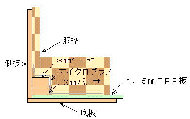 脚取り付け部です。 メインギヤーの曲げの力を受けるバルサ−ベニヤの複合材は側板、胴枠、底板の3面支持 により固定されています。 この部材の接着も瞬間接着剤で行っています。 ![]() 1.5oFRP板のベースに脚の胴体固定部分が刺さる部分から成ります。 脚のピアノ線が刺さるところにこの機体唯一のベニヤ材が使われていて、FRP板とベニヤ板 で脚のトーションバー曲げの力を受けます。 マイクログラスで補強して、力の分散を 計っています |