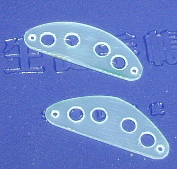 これも毎度、1.5oFRP板より切り出したエレベーターとラダーホーンです。 上の奥行きのない方がエレベーター用で下がラダー用です。 切れ込みを入れて差し込み、 瞬間接着剤で接着しているだけですが、これが結構強力にくっつき強度的な不安はまるで ありません。 ちなみにホーンの幅はサーボホーンに合わせてあります。 穴は軽量化の為ではありません。 単なる”こけおどし”です。 |