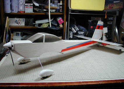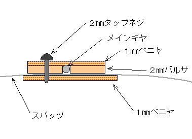 フイルム貼りが終了し、尾翼を接着してモーターや脚をセットしてみたところです。 フイルムは例によってオラライトです。 特に変わった事はしていません。 尾翼類の接着にはエポキシ接着剤ではなく瞬間接着剤で接着してマイクロバルーンで補強 してあります。(小技のコーナーを御覧下さい) まだメカ類は載っていません。 キャビン部分はR/C CAR用のスプレー塗料のスモークグレーでグラデーションっぼく塗って みました。 カラーリングのコンセプトは”スバル”っぽいホームビルド機です。 ![]() ![]() スパッツは上の図のようにして固定しています。 タイヤは40oのスポンジ製で、テトラのU形を使っています。 スパッツとのクリアランスを確保するためです。 |