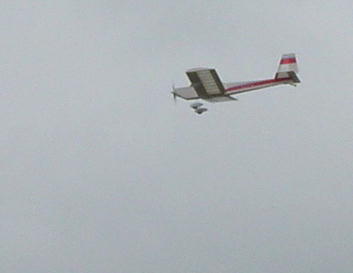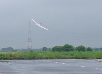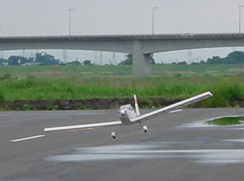フライトは軽量機のフライトその物です。 離陸は5メートルも走れば離陸可能速度に達します。 軽く右にラダーを当てて序々に スロットルを上げていくと、フルスロットルに達する前に離陸してしまいます。 ただし、脚に1.8oのピアノ線を使用していますので、路面抵抗が多かったり、草が長目 だったりすると、脚が負けてしまいます。 また、胴体は側板が薄い上に低翼機のため、手投げ発進はいささか困難です。 ランディングは機体重量のの割に抵抗が大きいのか、スロットルを閉じるた時の速度低下が 大きめに感じます。 余りグライドしてきません。 モーターをカットしてしまわず、なめるようにランディングすることを心がけます。 フライトはとても素直で、舵の反応も良いようです。 スパッツとキャノピーのデザインから実機のモーターグライダーの様な印象を受けます。 Eプレイリーの次あたり....、工作の腕試しにいかがですか?。 飛行画像は尾島スカイポートでの物、撮影はよよよさんです。 |