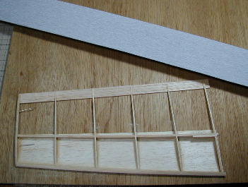 ![]() 翼端部分はテーパーになっていますので、組んでから翼厚を落とす作業をします。 組み立て自体は通常のスカイウォークとなんら変わりありません。 上に写っている白っぽいものが特大サンディングボードです。 これは、ホームセンターで「木っ端どれでも100円」コーナーで買った 床材の切れ端に、ロール状のの糊付きサンディングペーパーを貼って作りました。 削り上がった翼端部分、薄くなってフニャフニャでなんとも心許ないものです。 そこで、1oバルサで下の画像のように補強を入れました。 ![]() リブ間にきっちり入る「Lビーム」状の補強です。 これだけでもかなりしっかりしたものになりました。 右が整形後、左が整形前です。 |