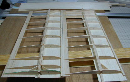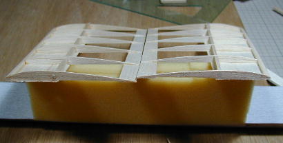 短径部分の製作です。 まず、キットに入っているまち針でしっかり止められたリブを一度バラして下さい。 スカイウォークには3ミリ、2ミリ、1.5ミリ厚の3種類のリブが使われています。 キット開封後、まち針で止まっている状態は、両端に2ミリ、中央に3ミリ、 その間に1.5ミリ厚のリブが並んでいると思います。 そのままテーバーを付ける作業をしてしまうと、翼中央接合部に入る3ミリ厚の リブが薄くなってしまいます。 リブをまとめた状態で片側に1ミリ航空ベニヤで作ったテンプレートを両面テープで 貼り付けてあります。 ![]() この状態でリブを削り込み7.5〜7%のプログレッシブリブをつくります。 成型が終わったら、リブをバラし、通し番号を振っておきます。 一枚として同じ形のリブがありませんが微妙なので、バラバラにしてしまうと 区別が付かなくなってしまいます。 更に、端から2まいずつ重ねて、同じ大きさになるように成型して左右に分けます。 |