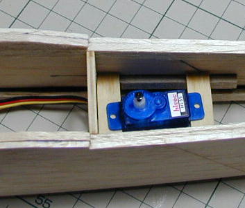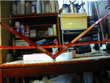 尾翼の取り付けです。 この機体はVテールですが、この尾翼形状は主翼との水平が解りづらいですね。 今回は上の画像の様に主翼の両端と尾翼の両端に水糸を張って、それが 重なって見えるように調整して水平を出してみました。 |