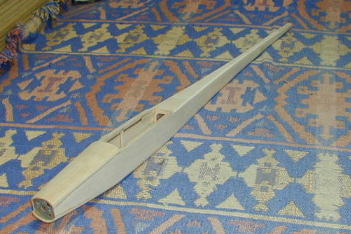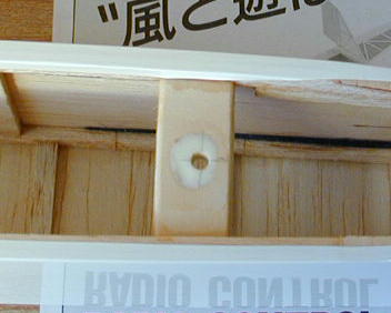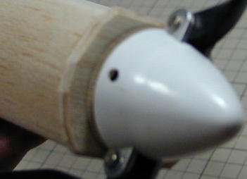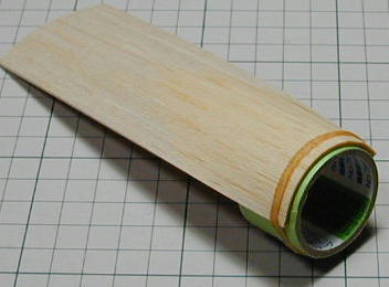 ノーズ部分のプランクに使う1.5ミリバルサは濡らした後、紙テープの 芯などに巻き付けて癖を付けておきます。 先端は直径30ミリまで丸めますので、割れ防止です。 プランクをしました。 着陸時の衝撃を考えて、裏面をグラスで補強してみました。 この角度から、胴枠のカーボンロービング補強が良く解りますね。 胴体後部、及び底部を1.5ミリバルサでプランクしました。 モーターマウントの取り付けが良く解るカットです。 これに、右に写っている「お面」を接着します。 ピンぼけですいません。 スピンナーに合わせて、お面を成形します。 |