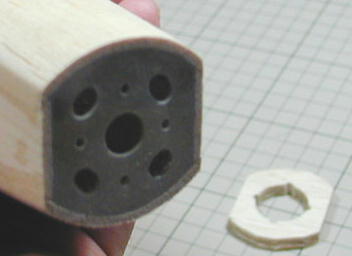 ロックネジ受けです。 3ミリベニヤに10ミリほどの穴を開けてマイクロバルーンエポキシを充填、 硬化後に3.5ミリの穴を開け、M4のタップでネジを切ります。 |