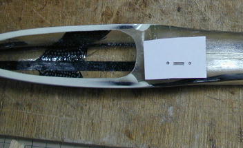 これが今回使ったポッドです。 胴体側部のカーボンクロス補強の面積を 増やし、その周辺のカーボンロービングの量を増やしています。 その反面 クロスを20g/m2+100g/m2の2プライから48g/m2の2プライに変 更して全体の重量は前作と同等に抑える事に成功しています。 この画像はポッドへ電源スイッチの穴開けを行っている物ですが、 ポッドの補強が良く解ります。 斜めに貼られたカーボンクロスとポッド 底部のカーボンロービング補強です。 ![]() 今回の大きな変更点である水平尾翼の取り付け方法です。 Radina− DLGと同じく、バルサブロックから削りだした台座に水平尾翼を固定しま す。 ただし、尾翼はネジ止めではなく、1ミリカーボンロッドで水平尾翼と 台座、カーボンパイプを串刺しにしてあります。 ![]() |