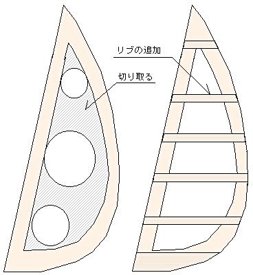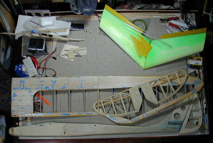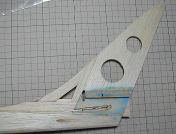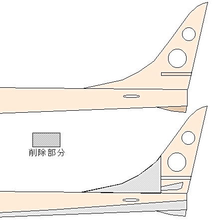 ![]() フイルムを剥いだ胴体を眺めていて、テール部分の太さが目に付きました。 オリジナルは結構スマートでしたし、側板にかなり堅いバルサが使われていたので 強度的にも問題無さそうです。 思い切って切り取りました。 ついでに、ワイヤー+普通のホーンでリンケージされていたエレベーターリンケージ を内装することにし、リンケージの加工もしました。 ![]() リンケージを内装する事に伴い、元々3ミリ程度の単板バルサで出来ていた垂直 尾翼を1.5oバルサでプランクしました。 元々エレベーターリンケージ用のワイヤーが通っていたフレキシブルチューブは アンテナ線を通すことにします。 垂直尾翼が厚くなった分、ラダーも厚みを持たせないといけません。 ![]() オリジナルのラダーは垂直尾翼と同様に丸穴で肉抜きされた物でしたが、 その部分は潔く切除してリブを組んでみました。 3メートルB.O.T.も この様なリブ組で出来ています。 |