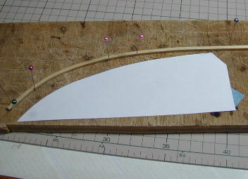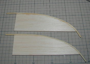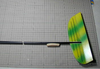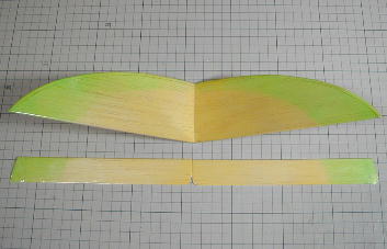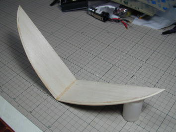 尾翼はランディング時の破損を防ぐためにVテールとしました。 サイズは水平投影面積で水平尾翼容積が0.37となるように、また、 デザインはオリジナルのRadinaに似せた形としました。 飛ばした感じではもう少し小さくても(0.32位)良かったかも知れません。 材質は3ミリバルサの単板ですが、前縁に3*3のヒノキ材を貼って 補強としました。ヒノキ材は水を入れたペットボトルに一晩沈めて曲げ やすくしてからアイロンでしごいて曲げています。 V角度は110°、この時点の接合は瞬間接着剤です。 |