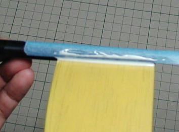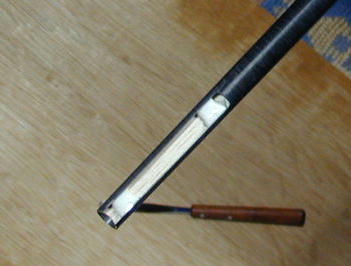 パイプに切れ込みを作り、2oバルサで台座を作りまた。 この画像は尾翼接着直前で、前後に付いている白い物はマイクロバ ルーンを大量に混ぜ込んだ5分エポキシです。 この後の接着自体 は瞬間接着剤です。 更にパイプにマスキングをして、マイクロバルーンエポキシでフィレットを 作って補強としました。 |