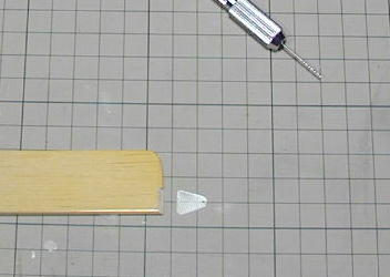 ラダーベータのコントロールホーンは0.5ミリFRP板で、動翼にベースを 作り、瞬間接着剤で接着しました。 ヒンジはお馴染みのOHPシートで 5ミリ幅に切った物を片側3枚ずつ使いました。 |