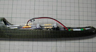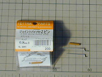メカを搭載しました。 ノーマルのRadinaと同様、はしご型のサーボベッドを接着してサーボ を固定します。 右が機首で、機首側からラダーベータ用サーボ、エル ロン用サーボとなっています。 横から見るとこんな感じになります。 ロッドが整然と列んでいて気持ち良いですね。 最近よく使うアイテムです。 コントロールロッドとサーボに付けるZクランク部分を連結するアルミパイ プで、アルミパイプとZクランクがセットになっています。 長さを合わせた ら軽くニッパーでかしめて瞬間接着剤で固定します。 付属のZクランク はおおざっぱな作り(上側)なので、この部分は自分で作った物(下側) を使っています。 |
