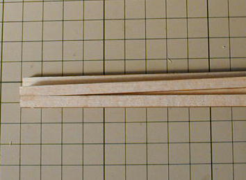 胴体底部と上面のプランクは、キットの指示では長手方向に縦目のバルサを 貼る事になっています。 ですが、この手法ではテール部分の捻れ剛性に 不満がありました。 ただでさえ大きな尾翼がそそり立ちますので、キットの プランク材を使い、横目にプランクする事にしました。 |