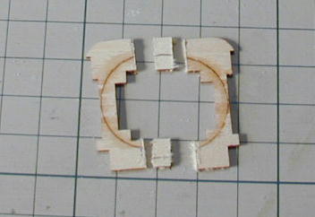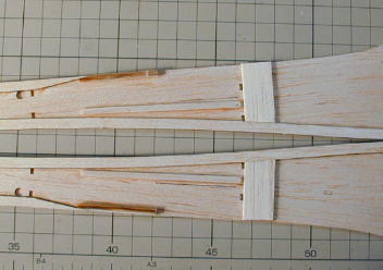 上の画像はバルサシートから色々なパーツを切り出す際の弊害とでも 言うべき物で、ノーズ部分をきっちり合わせた時のテールエンドの物ですが、 5ミリ程度のずれが出来てしまっています。 直線が合っている方を基準に無理矢理形にするしかありませんね。 胴体側板は1.5ミリバルサで隅には3ミリのウエブ材が入ります。 また、胴体の主翼後縁より前は、全面1.5ミリバルサの裏打ちがあります。 かなりの過剰補強です。 |