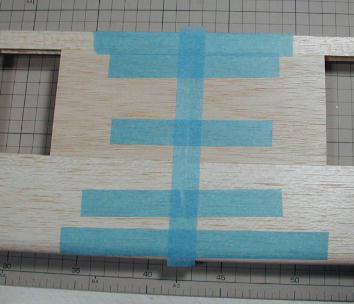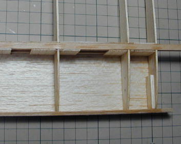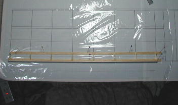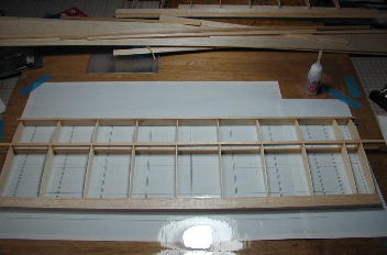 組み立てはいつものように図面の上にラップを敷いて、その上で行い ます。 捻れには細心の注意を払って下さい。 捻れを懸念して、後縁 は上下面をプランクまでしてから定盤から取り外しています。 強度の決め手のウエブ材ですが、後ろ側はフルに、前側はリブとスパー 接する部分だけにしてあります。 エルロンサーボのサーボベッドはこの時点で作り付けておきます。ベッド 自体は2ミリベニヤですが、台になる部分は3ミリバルサです。 |