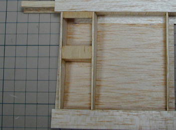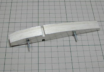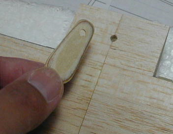 エルロンは当初、出来合のエルロン材を使おうと思っていたのですが、 重量との折り合いが付かず、リブ組で作る事になりました。 ヒンジが入る 前縁部分は4ミリバルサ、リブとなる部分は1.5ミリバルサ、後は1ミリ バルサです。 |