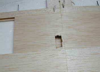 サーボは左側にオフセットして取り付けます。 胴体の幅自体が狭いので、 ギリギリ中心へ寄って取り付けます。 予めサーボベッドが作り付けて ありますので、それに合わせて穴を開けます。 中央寄りの小さな切り欠き はサーボコードの逃げです。 |