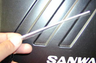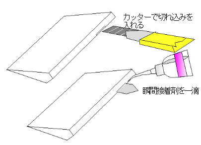 ヒンジに使う OHPシートを使う機体に合わせ、図のように切り取りヒンジにします。 HLGなら4o程度、電動飛行機なら10o位あれば充分でしょう。 接着力を高めるために切れ込みを入れるのも手です。 装着は差し込んで隙間に低粘度瞬間接着剤をしみこませるだけです。 OHPシートはPET素材で出来ているため、曲げ強度は抜群。 テレビを見ながら2時間ほど折り曲げ続けましたが、白くなっただけで 切れませんでした。 例のザラザラは燃料にも侵されないのでGP機にも使えます。 |