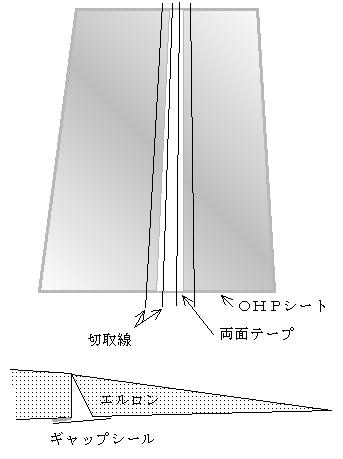 透明タイプの事務用両面テープを左図の 様にOHPシートに貼ります。 透明タイプでなくてもかまいませんが、 仕上がりが綺麗です。 ギャップの大きさに合わせて図の切取線で 切り取ると2本のギャップシールが出来上がり ます。 ちなみにSCOTTでテープ部3o、シール部 は8oです。 |