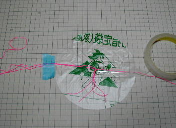 | 切り取ったポリ袋に水糸をセロテープで放射状に貼り付けていきます。 テープはクリアテープの方が強くて良いでしょう。 糸の本数は傘のサイズにもよりますが、作業の簡易性を考えて4本としました。 |