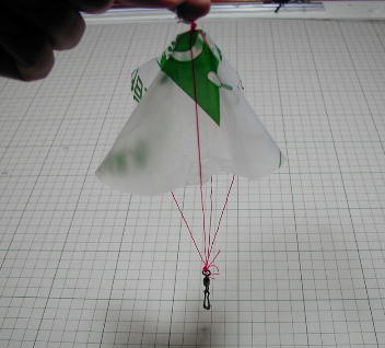 | サルカンとリングを結びつけて完成です。 傘にあたるポリ袋にはいっさい力が掛からない構造ですので安心して使えます。 見てくれは悪いですが材料費は格安です。 自作ショックコードのグレードアップにいかがですか? |