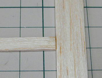 尾翼などのリブ組やトラス組は結構大変な物です。 正確に切り出されたパーツを組む場合は問題無いのですが、自作や寸法を合わせて 自分で部品を正確に切り出すのは至難の業です。 付き合わせて、瞬間接着剤を流して一通り組み上がった物を裏返して見ると.... この様にすき間が開いてしまった...何て事は良くある事です。 でも、このままでは見栄えが悪いばかりでなく、強度も著しく低下してしまいます。 |