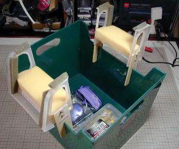 足の切り欠きをコンテナに引っかければできあがり。 出来上がった後に、機体保護にスポンジを両面テープで貼っています。 |