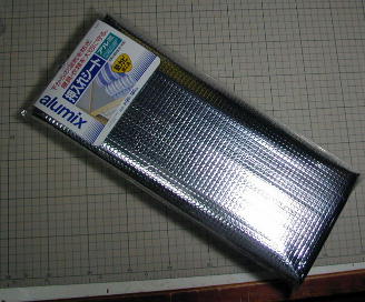 材料はこれ。 ホームセンターで売っている「押入れシート」発泡素材にアルミが蒸着してあります。 250円で一機分のカバーが作れます。 また、梱包材売り場にはロールになった5メートル巻きのものが1000円ちょっとで 売っていますので、何機分か作るのならこちらの方がお得です。 |