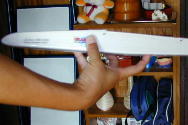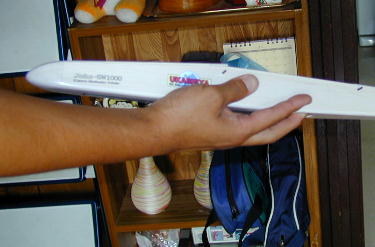 | まず、きむらクラフトが基本としているのはテイクバック時に機体が進行方向を向いている と言う事です。 これをふまえて二通りの持ち方をしてみました。 この持ち方はきむらクラフトがフィンガーバーを傾けて取り付ける以前にしていた持ち方です。 この持ち方は機体を保持しているのが親指と薬指、小指の腹だけです。 ポッドがゆがまない程丈夫なら問題は無いのですが、軽量FRPポッドの場合では 風であおられたり全力で走った時にはポッドがゆがんだりして機体が傾いてしまいます。 また、汗等で滑ったり下手をするとポッドを壊したりしかねません。 これは現在のきむらクラフトの持ち方です。 ポッドを包み込むように持っているので がっちりホールドする事が出来ます。 ただ、この方法も完璧ではありません。 私の様に関節や筋が固い場合、この状態でテイクバックをすると機体が進行方向を 向いてくれません。 無理に向かせようとすると腕が痛くなったり、バーにかかる指が人差し指だけ曲がった 状態になってしまいます。 おわかりでしょうか? これを解消するためにフィンガーバーが曲がって取り付けられているのです。 ちなみに、バーの位置は現物合わせです。 重心位置はあまり気にせずに持ちやすい場所、角度に取り付けるようにしています。 |