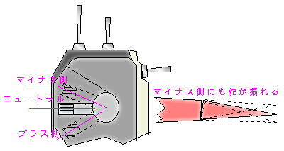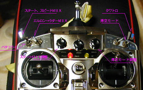 実際に私が使っているFF9でのスイッチの割り当てです。 バタフライ動作の時は、左全面のスイッチを下に下げ、スロットルスティックを下げます。 上に書いた理由により、ミキシングスイッチは常時ONにはしておけないのです。 全面に付いているボリュームのAとCをスタートミキシングと滞空ミキシングにリンク させて、風の強弱にって調整が出来るようになっています。 ラダー、エルロンミキシングはスイッチによってON−OFFが出来るようにしています。 左肩のスイッチを横から見ました、 一つのスイッチでスタート、通常、スピードの3モードを切り替えるようになっています。 このスイッチ割付は固定で、ユーザーが変更する事は出来ません。 FF9のセールス ポイントとしてメーカーが挙げるサイドボリュームが見えます。 滞空モード時のフラッ プの下げ具合がこれでコントロール出来れば最高なのですが、ニュートラル位置が はっきりしないために使うのを躊躇しています。 ![]() そのまま使おうとすると、滞空モードでもニュートラルより上はマイナス側に舵が 動いてしまいます。 ニュートラルを示すのは、ニュートラル「付近」にレバーが 入った時になる「ピッ」という音だけです。 木村の技量では飛行中に、この音を頼りにニュートラルを出すような事は無理です。 他のHPにはミキシングを駆使して使えるようにする方法も載っています。 ニュートラル位置が簡単に送信機側でオフセット出来ると良いのですけれど.... |